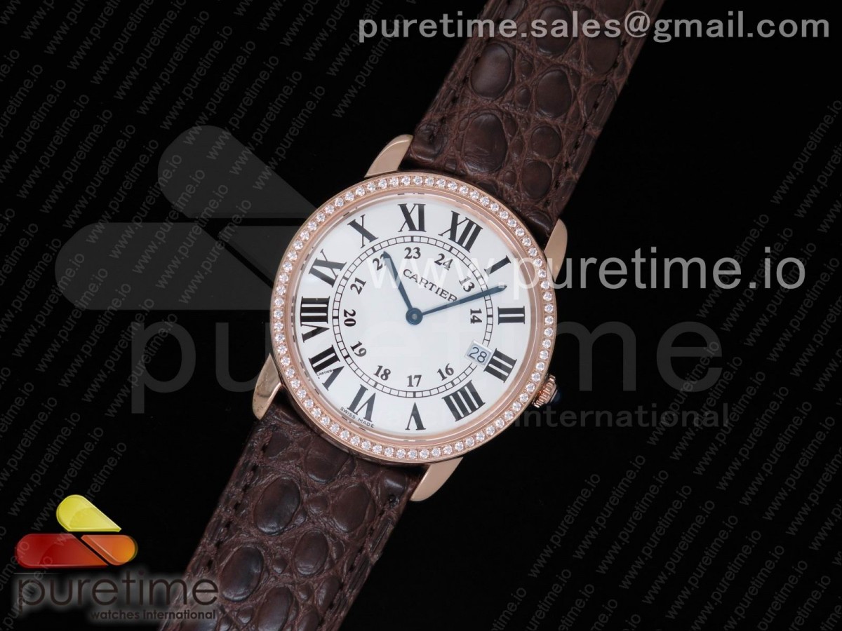 K11F 롱드솔로 미듐 36미리 화이트다이얼 로즈골드금통 다이아베젤 블랙악어가죽스트랩 Ronde Solo De Cartier 36mm RG K11 Maker White Dial Diamonds Bezel on Brown Crocodile Strap Ronda Quartz