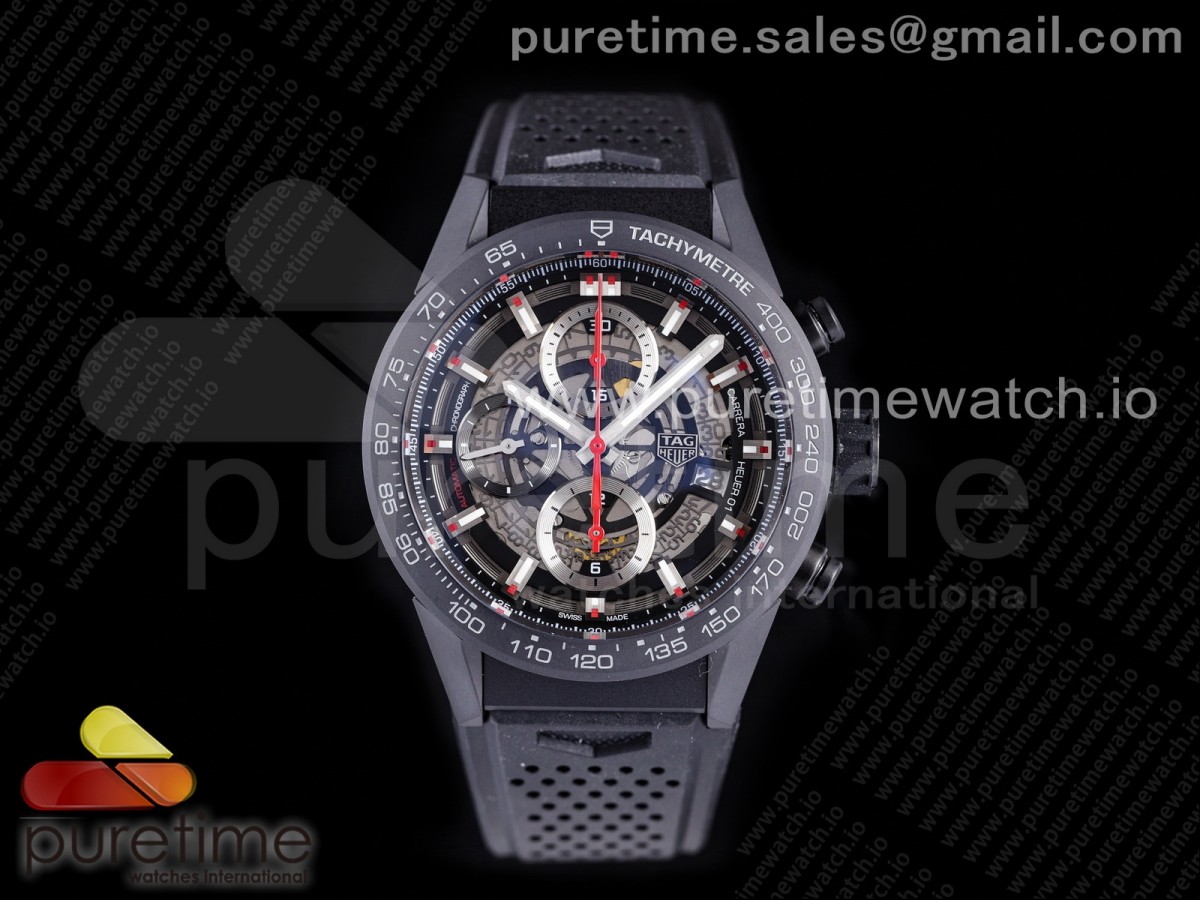 XF 태그호이어 칼리버호이어 크로노 세라믹케이스 스켈레톤다이얼 블랙러버스트랩 Calibre Heuer 01 Chrono 43mm Ceramic XF 1:1 Best Edition Skeleton Dial Red Hand on Black Rubber Strap A1887