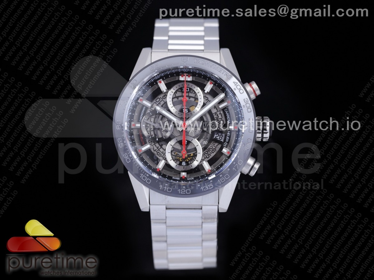 XF 태크호이어 칼리버호이어43 스켈레톤다이얼 스틸브레이슬릿 Calibre Heuer 01 Chrono 43mm SS XF 1:1 Best Edition Skeleton Dial Red Hand on SS Bracelet A1887 > 태그호이어(TAG HEUER)
