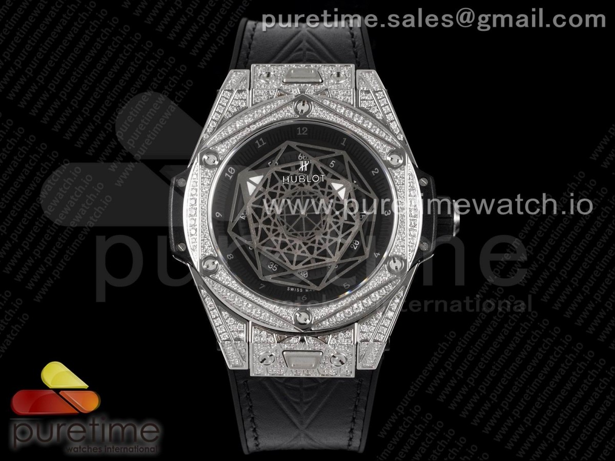 HBF 위블로 빅뱅 유니코 상블루 다이아케이스 스켈레톤블랙다이얼 블랙거미스트랩 Big Bang Unico Sang Bleu SS Full Diamonds HBF Skeleton Dial on Black Gummy Strap HUB1213