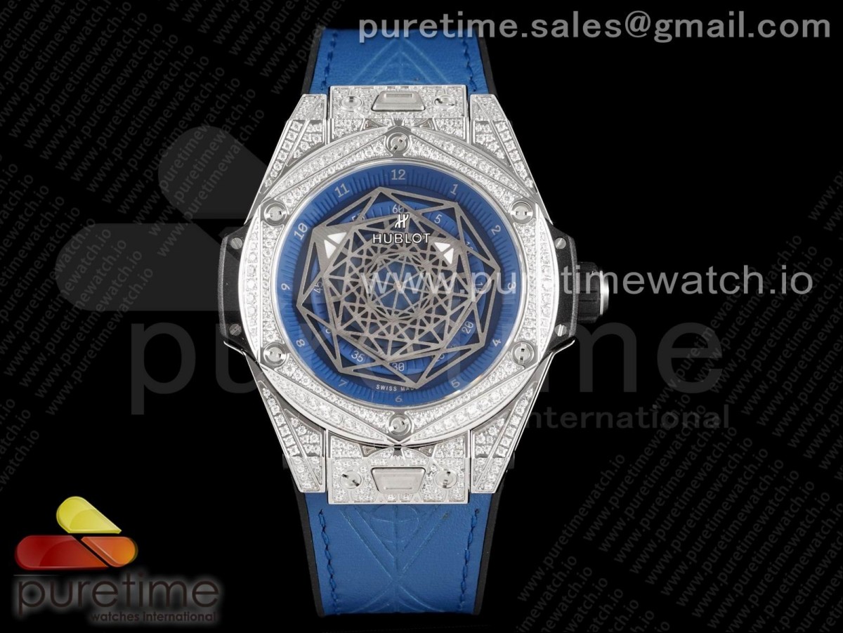 HBF 위블로 빅뱅 유니코 상블루 다이아케이스 스켈레톤블루다이얼 블루거미스트랩 Big Bang Unico Sang Bleu SS Full Diamonds HBF Skeleton Dial on Blue Gummy Strap HUB1213