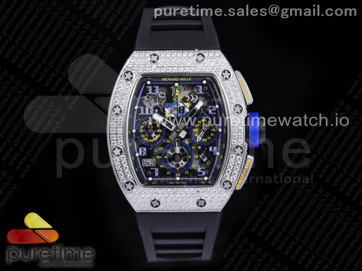 KVF V3 리차드밀 RM011 크로노 다이아베젤 크리스탈다이얼 블랙러버스트랩 RM011 SS Chrono KVF 1:1 Best Edition Diamonds Bezel Crystal Dial Black on Black Rubber Strap A7750 V3 > 리차드밀(RICHARD MILLE)