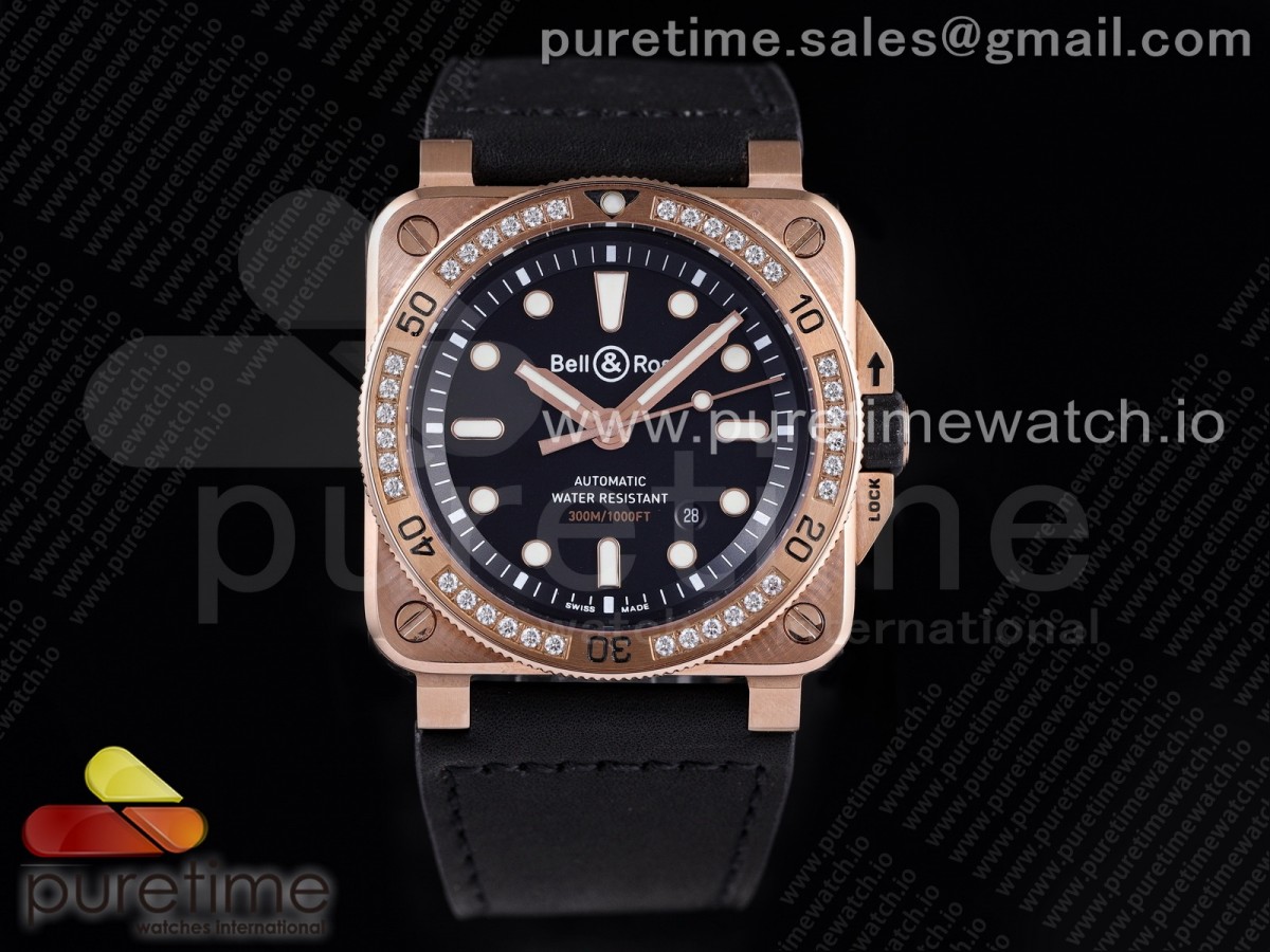OXF 벨앤로스 다이버 BR 03-92 로즈골드 블랙다이얼 다이아베젤 블랙가죽스트랩 BR 03-92 Diver RG OXF 1:1 Best Edition Black Dial Diamond Bezel on Black Leather Strap MIYOTA 9015 (Free Nylon Strap)