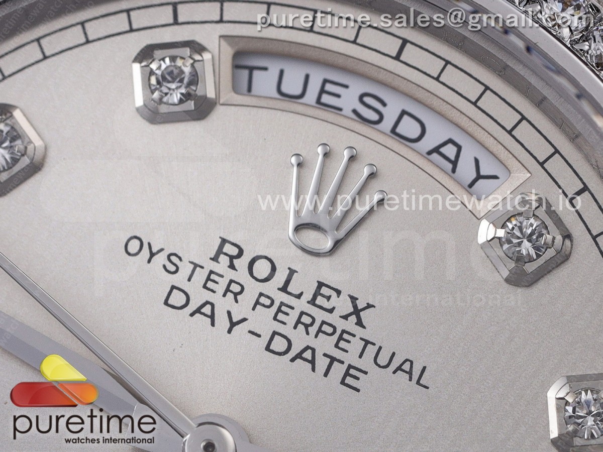 GMF 롤렉스 데이데이트36 실버다이얼 다이아베젤 다이아인덱스 스틸브레이슬릿 Day Date 36 128239 GMF 1:1 Best Edition 904L Steel Silver Dial Diamonds Markers and Bezel on Bracelet A2836 > 롤렉스(ROLEX)