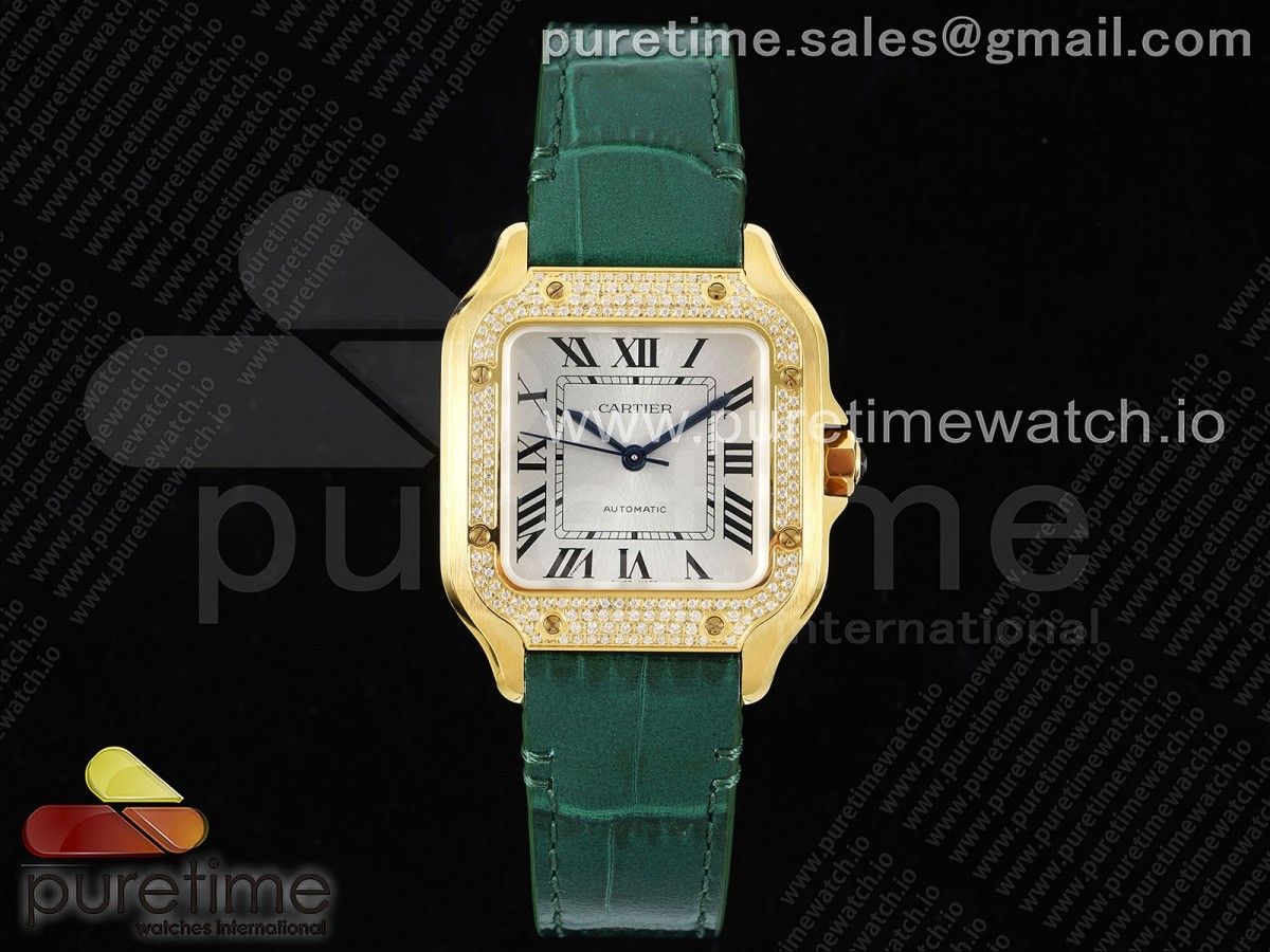 3KF 까르띠에 산토스 미듐 옐로우골드 다이아베젤 화이트다이얼 그린가죽스트랩 Santos de Cartier 35mm YG 3KF 1:1 Best Edition White Dial Diamonds Bezel on Green Leather Strap MIYOTA 9015